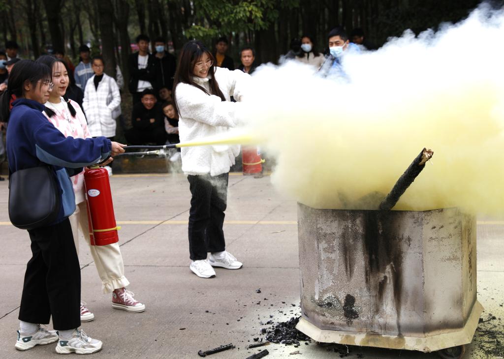 学校近200名学生代表在现场观摩和体验了干粉灭火器灭火的操作步骤及要领。各学院学生代表分组进行了干粉灭火器实操演练,随着火焰一次次燃起和扑灭,反复强化了学生们对干粉灭火器的使用要领。