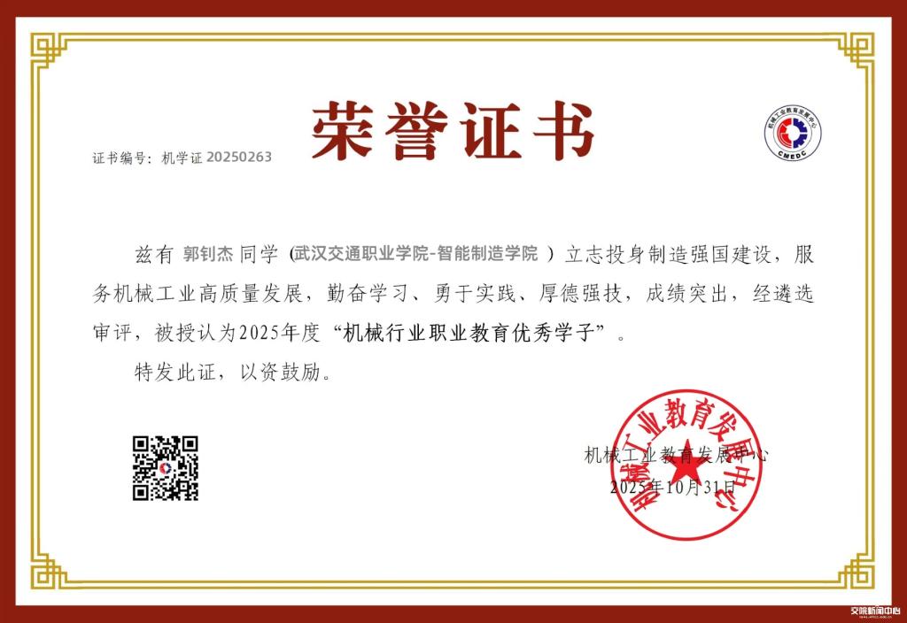 新闻网讯(记者 邓俊芬 谢芳)近日,机械工业教育发展中心正式公布首届“机械行业职业教育优秀学子”认定名单,我校低空与航天装备学院2025届毕业生郭钊杰同学榜上有名,荣膺此项国家级行业重要荣誉。全国共有496名优秀毕业生获此认定,郭钊杰同学的入选彰显了我校在高素质技术技能人才培养方面的显著成效。