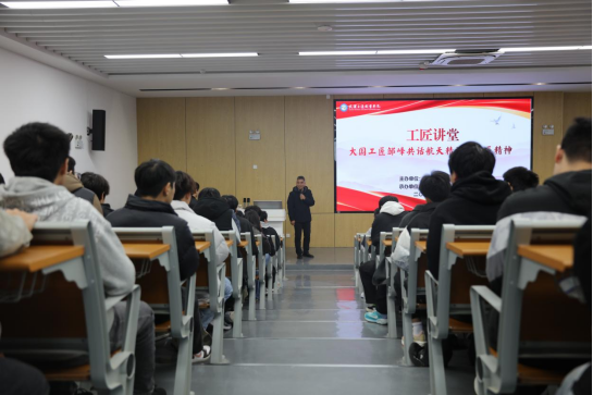 讲座在尚能楼314阶梯教室举行,现场座无虚席,气氛热烈。邹峰从世界航天发展格局与前沿技术动态谈起,深入剖析了当前我国航天事业面临的机遇与挑战,激发了在场学子投身航天、技能报国的热情。他以平实而真挚的语言,回顾了自己从一名普通工人成长为大国工匠的数十载奋斗历程,通过一个个攻坚克难的鲜活案例,生动诠释了何为精益求精、何为执着专注。邹峰还特意带来了亲自加工的精湛工件——一块高精度钛合金构件和一支太空专用笔,让同学们近距离观摩、传递感受,深刻体悟何为“匠心铸就”。