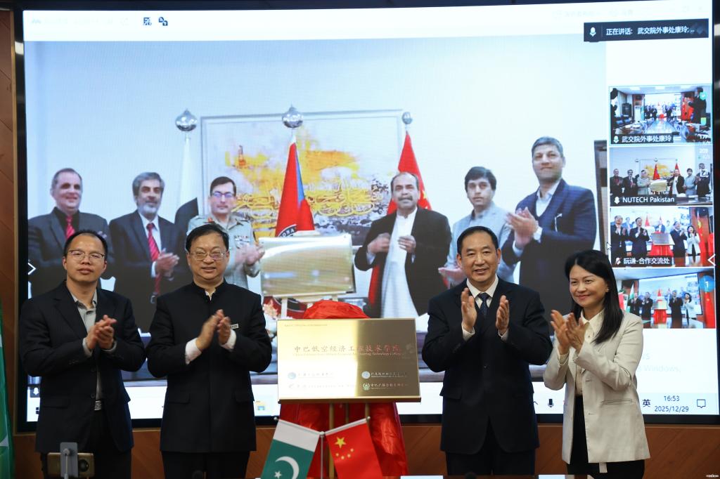 新闻网讯(通讯员 康玲)12月29日,武汉交通职业学院、巴基斯坦国家技术大学、北方天途航空技术发展(北京)有限公司、中巴产教合作卓越中心四方共建的“中巴低空经济工程技术学院”签约暨揭牌仪式在线上线下同步举行。中巴产教合作卓越中心中方主席李劲松、北方天途航空技术发展(北京)有限公司董事长兼深圳无人机协会副会长杨苡、校长周慎、外事处处长阮谦、无人机应用技术专业负责人朱一多、外事处副处长李爽线下参加仪式,巴基斯坦国家技术大学巴基斯坦国家技术大学校长莫阿扎姆·伊贾兹及巴方相关领导线上出席。仪式由副校长谢计红主持。