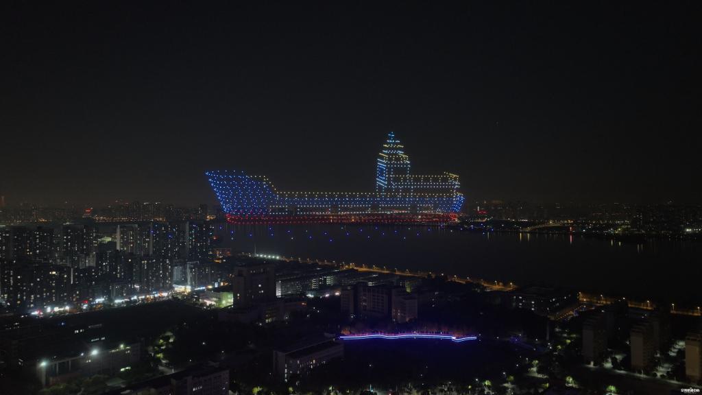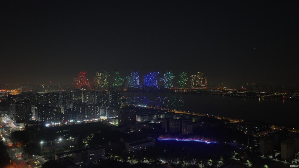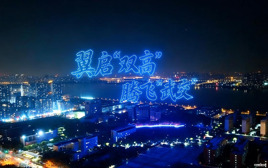会议结束后,与会领导与嘉宾移步至学校南苑运动场,共同观看了由学校联合企业精心准备的无人机灯光秀技能展示。一千架无人机腾空而起,在夜空中变幻出致远号、交小韵、校徽、“翼起双高 腾飞武交”等绚丽图案和字样,科技感与艺术性完美交融,不仅生动展现了学校将前沿技术融入教学实践、以创新驱动人才培养的丰硕成果,更是一堂激励学子胸怀“国之大者”、锤炼过硬本领、投身强国伟业的沉浸式思政大课,为本次年会画上了圆满的句号。