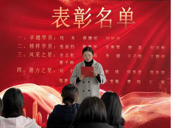 随后,陈曼宣读了“潜力之星”“风采之星”“榜样学员”“卓越学员”四大奖项表彰名单。在全场见证下,与会领导、企业导师依次为获奖学员颁奖。这份荣誉不仅是对他们过去一年勤学善思、实干奋进的肯定,更成为激励全体学员砥砺前行的强大动力。