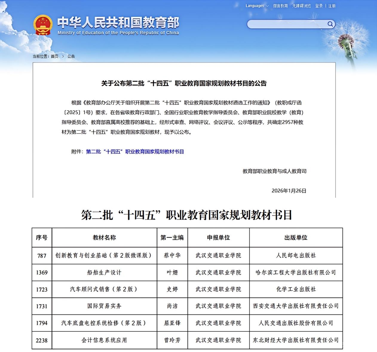 新闻网讯(通讯员 段慧敏)1月26日,教育部正式发布《关于公布第二批“十四五”职业教育国家规划教材书目的公告》,我校组织申报的6部教材成功入选,入选数量位居全省高职院校第二位,至此我校“十四五”职业教育国家规划教材总数增至17部。