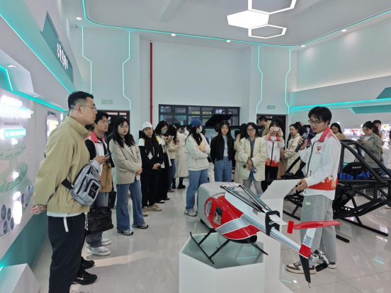 随后,一行人来到学院点点飞创无人机产教融合实践中心。面对琳琅满目的无人机机型、高精度航拍设备及工业级巡检装备,志愿者们逐一介绍经纬系列专业机型的技术特点,并结合实际案例讲解其在电力巡检、灾害救援、自然资源监测等领域的典型应用。大队辅导员们驻足询问技术细节,志愿者们耐心解答,展现了扎实的专业功底和良好的服务意识。