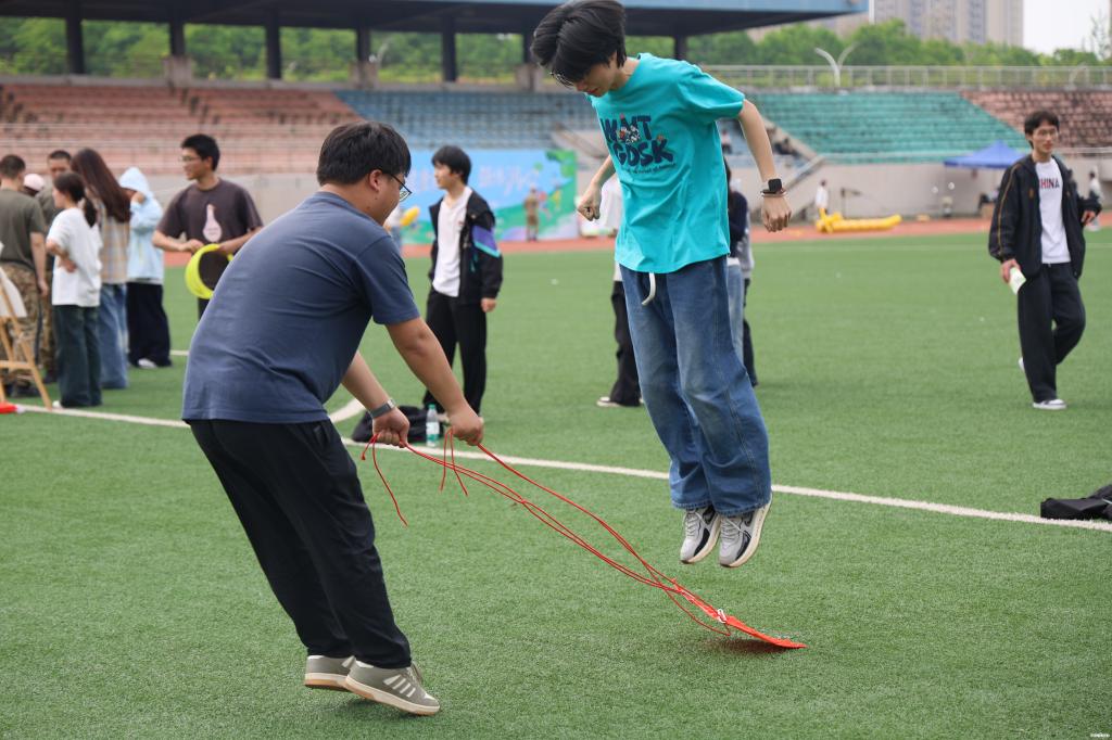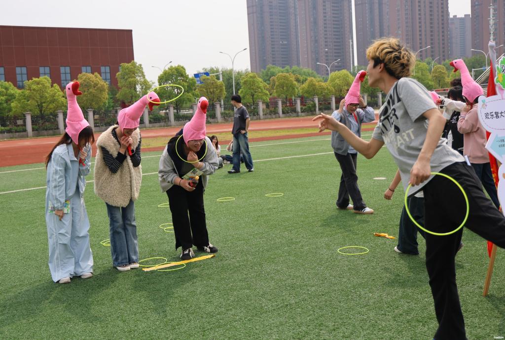 团队协作区,默契与欢笑交织。“你拉我跳”项目中,两人一组,一人拉动跳板,一人向前跳动落在跳板上,既考验肢体协调能力,又考验情感联结;“不倒森林”区域,队员们围成一圈紧握长杆,随着口令齐步移动,一只手松开、另一只手迅速接住邻伴的杆子,部分队员反应稍慢导致杆子倾斜,引得大家连忙伸手补救;“鼓动人心”项目则展现了高度配合的协作场景,八个人拉着绳子控制鼓面,排球在鼓上弹跳,每一次成功颠球都伴随着整齐的欢呼。“欢乐套大鹅”则趣味十足,四人一组的搭档分工明确,三人头戴憨态可掬的大鹅头套原地待命,一人手持圆环瞄准“目标”。有人运气极佳、出手即中;有人屡投不中却越挫越勇,围观同学纷纷踮脚出谋划策,此起彼伏的加油声与欢笑声交织,让每个人都彻底卸下了心理防备。
