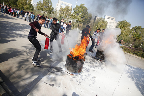 11月6日,为进一步提高全校师生的防火意识,加强我校消防工作的应急防控能力,师生员工灭火技能演练比赛在交院大道南侧举行,各学院及相关职能部门共16支代表队参加演练。竞赛分为灭火器灭火和水枪灭火,现场,烈火熊熊,一声口令响起,各组人员迅速拿起灭火器冲向着火点灭火,火种很快便被熄灭,冒出浓浓的白烟。评定小组根据用时长短、动作规范、效果优良进行打分。最后,机电工程学院获得第一名。