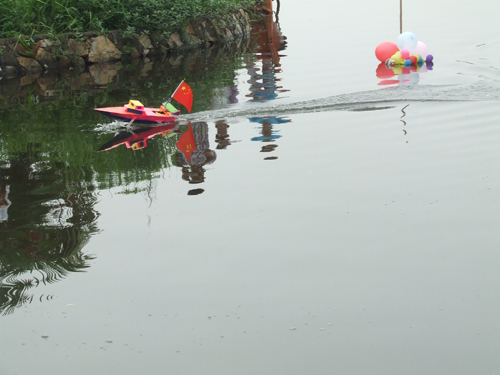 船舶与轮机工程系的参赛选手们,在校园“连心湖”演示了他们研制的“滑翔板式快艇模型”的航行情况,引来了不少感兴趣的同学。