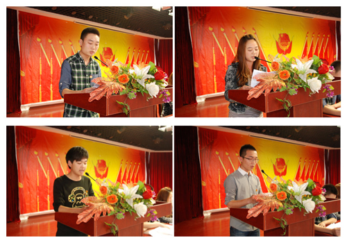 优秀共青团员代表张家驹同学、共青团干部代表陈霜叶同学、学生干部代表张玉鑫同学、青年志愿者代表秦奋同学先后发言,感谢学院的教育和培养,回顾一年来的工作历程,表示在今后的学习和工作中会更加严格要求自己,以身作则,率先示范,为学院的建设与发展贡献自己的一份力量。