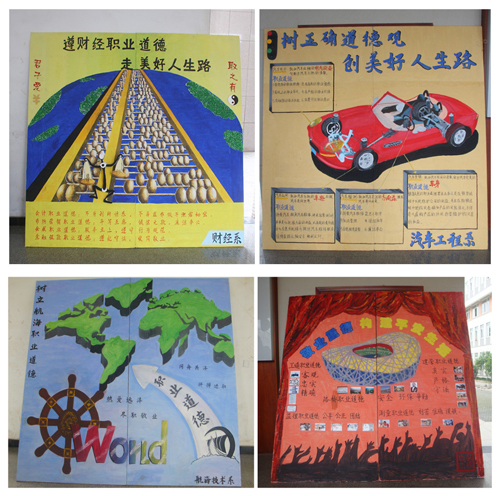 参展板报以各系团总支为单位,结合各系各专业的职业道德建设进行设计并展出。同学们设计的板报新颖,布局合理,美观大方,评委们对参赛作品进行了选评,并高度肯定活动的开展。财经系的板报以“君子爱财、取之有道”的主题为线索来展开,紧扣主题,突出职业道德在现在社会中的重要;电子信息工程系的板报以信息发展时代潮流为主题,勾勒出一幅精美的电路图;交通工程系的板报将专业特点与职业道德紧密结合,用缤纷的色彩绘出建筑人生大厦的图景;航海技术系描绘的操控船舵环游在海洋中,体现了未来掌握在自己手中的主题。