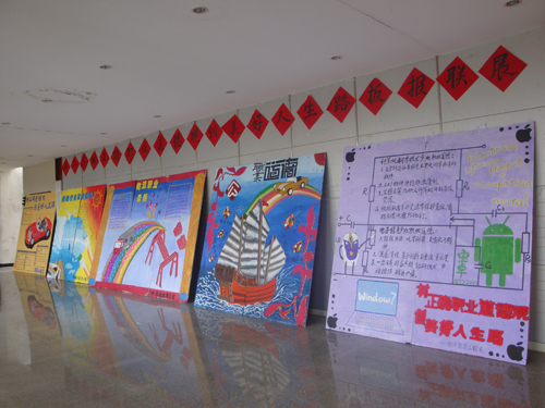 (史玉攀)5月9日下午,我院在南北教学楼之间举办第三届“树正确职业道德观、创美好人生路”板报联展的活动。本次活动邀请了党委宣传部长邓远祥、工会副主席刘履华、后勤集团党总支书记方艳山、党委学生工作部长薛传领、院团委负责人林阳、艺术系主任助理刘小艳、党委宣传部廖昭同老师担任评委。