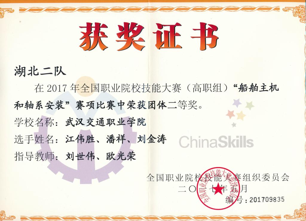 新闻网讯(记者 余雨龙 通讯员 王刚)5月24日,2017年全国职业院校技能大赛高职组“船舶主机和轴系安装”赛项在汉隆重开幕,我校船舶与航运学院组队参赛,与来自全国14个省市的20所高职院校代表队同台竞技。经过2天紧张激烈的角逐,船运学院江伟胜、潘祥、刘金涛等3名同学斩获高职组“船舶主机和轴系安装”赛项团体二等奖。