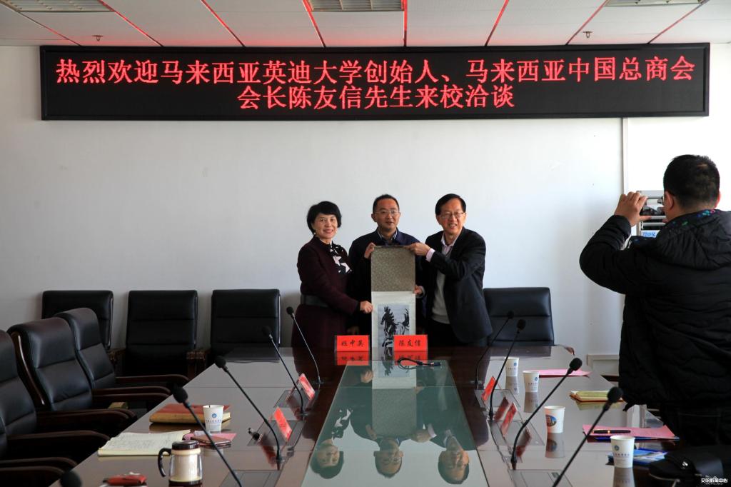 会上,副校长姬中英对马来西亚英迪大学创始人、马来西亚中国总商会会长陈友信一行的到来表示热烈欢迎,向来宾介绍了学校的基本情况,就学校近年来的国际合作,特别是与马来西亚吉隆坡建设大学开展的“2+2”学分互认项目做了详细介绍并感谢许高山总经理为此次访问所做的联系工作。马来西亚中国总商会会长陈友信表示马来西亚是东盟国家中第一个与中国建交的国家,华人华裔总数占马来西亚全部人口的23%,与其他东盟国家相比,马来西亚的学生无论是中文水平还是中华传统文化的认同感都是名列前茅的。习主席提出的“一带一路”倡议,在建设过程中要重视“五通”,陈友信会长认为民心相通最重要,文化的认同是民心相通的关键,是一带一路建设的社会根基,而马来西亚与中国都重视中华传统文化,这是双方合作最坚实的民意基础。近年来,马来西亚开始重视职业教育,陈友信会长希望通过此次访问加深了解,未来在校校、校企和校行上均能有所合作。随后,双方就合作的细节进行了深入洽谈,并约定下一次会晤的时间。会后双方互赠礼物并合影留念。
