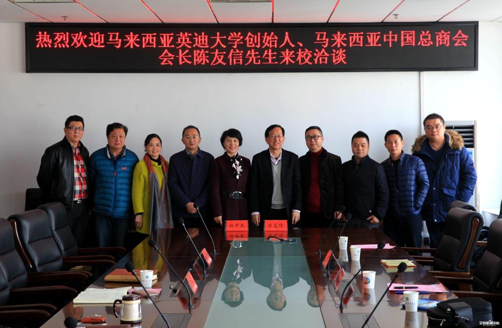 新闻网讯(记者 余雨龙 通讯员 周璞)12月5日上午,马来西亚英迪大学创始人、马来西亚中国总商会会长陈友信一行来我校交流访问,副校长姬中英、外事处处长杨昌蓉、电子与信息工程学院院长戴月及相关工作人员出席了此次会议。