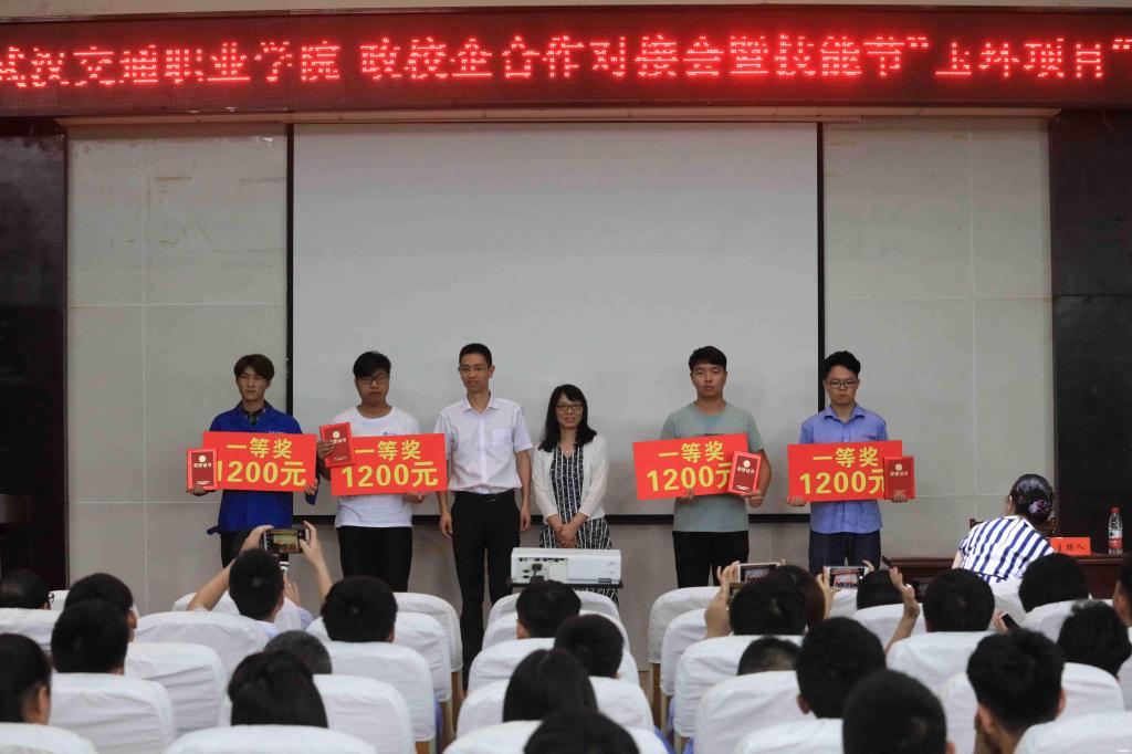技能比赛完成后,武汉交通职业学院王进思校长、姬中英副校长、合作交流处处长杨昌蓉、机电工程学院院长杨海澜、玉环市副市长陈建波、玉环市人力资源和社会保障局局长、浙江双环传动机械股份有限公司监事会主席董美珠、浙江中兴减震器制造有限公司人力资源部部长乐光红、浙江琦星电子有限公司行政总监杨艳苗等学校、玉环市政府和企业领导与机电工程学院校企合作订单班师生欢聚一堂,召开了隆重的“玉环市·武汉交通职业学院政校企合作对接会暨技能节“玉环项目”颁奖会”。大会由姬中英副校长主持,王进思校长、陈建峰副市长等领导亲自为获奖学生颁奖,获奖学生深感自豪和鼓舞。
