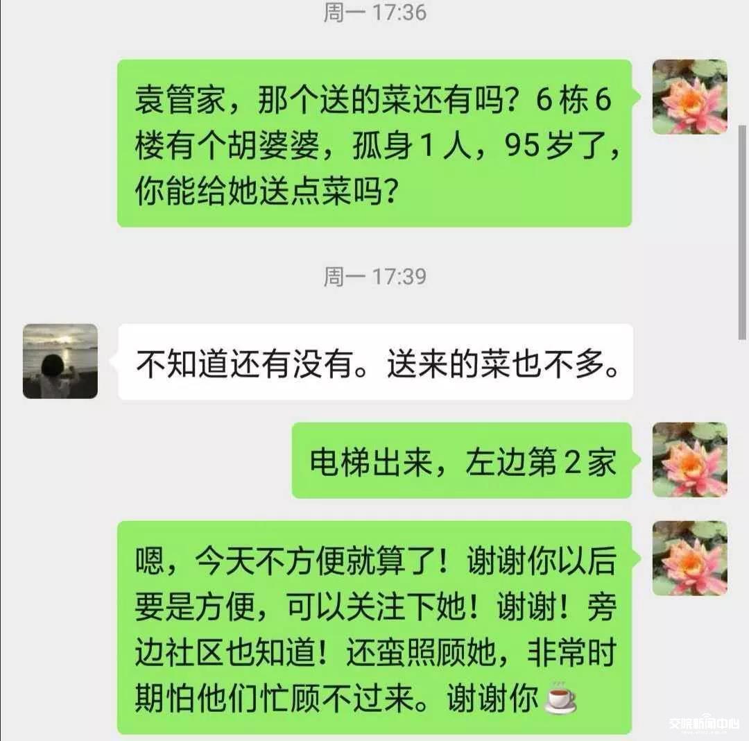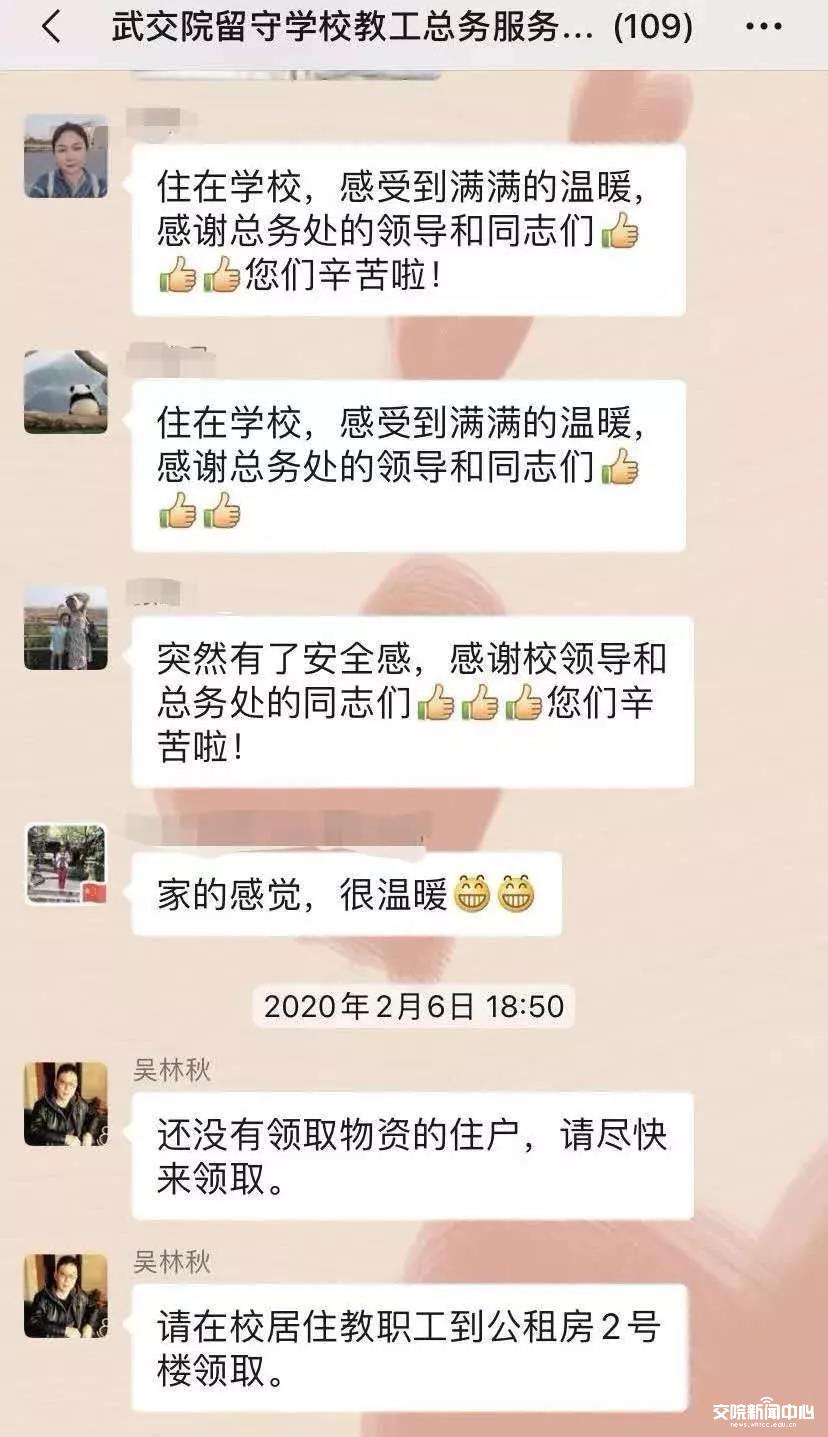 总务处压实工作,打通校园“保障线”。坚持每天组织人员对图书馆、校内洗手间、垃圾站、大门口、食堂周围、公租房、学生宿舍等公共区域进行消杀。总务长钟辉母亲病重,仍坚守在学校防疫一线,对内布控,对外联络;总务处综合科科长江洋在家里有疑似病例患者的情况下,每天登记在校居民体温,做好发热病例隔离等工作;物业管理中心主任吴林秋同志积极协助社区不定期的发放汤圆等生活物资及口罩、消毒液等防疫物资;在封校期间,总务处副处长廉智远在全市机动车实行禁行管理的背景下,冒着被感染的风险,外出为大家团购蔬菜、猪肉,充天然气;还有物业管理中心、基建与维修中心坚守岗位同志们,也随时在线,为大家排忧解难。“感受到满满的温暖”住在学校教职工在群里纷纷为他们点赞。