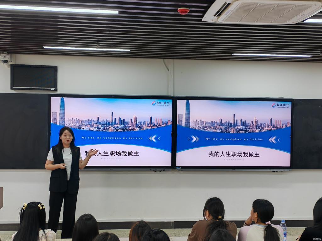 上午,学院在南301举办了一场别开生面的“企业家大讲堂”活动。此次活动特邀湖北长江电气公司总裁董莹女士来我院为广大学生开展一场职业规划与就业指导讲座,主题为《我的人生职场我做主》。