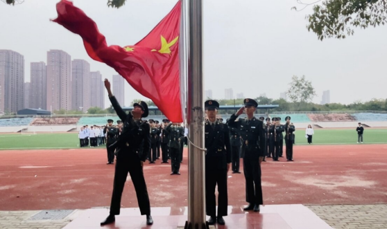 七时整,升旗仪式正式开始。军士学院国旗护卫队迈着铿锵有力的步伐,护卫国旗庄严入场。伴随着雄壮的《义勇军进行曲》,五星红旗在晨风中徐徐升起,全体师生肃立行注目礼。