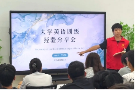 活动中,王根深清晰解读四级考试的题型设置与分值分布,帮助新生建立对考试的整体认知。随后结合备考周期,给出“基础夯实期、强化突破期、冲刺模拟期”的阶段性复习规划建议,让备考节奏一目了然。针对“听力关键词捕捉”“阅读答案快速定位”“写作模板灵活运用”等同学们最关心的高频疑问,他结合个人备考时的典型错题案例,进行技巧拆解与思路梳理,把抽象的方法转化为“听完就懂、拿来就用”的实用技巧。同时,他还贴心分享了背词APP、真题资料等优质备考资源,就“碎片化时间高效利用”“考前心理状态调节”等细节问题传授实战经验,每一个要点都戳中学生需求,大家纷纷执笔记录,生怕错过关键内容。