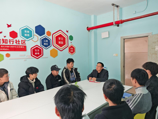 新闻网讯(记者 穆雨 通讯员 侯二牛 )为深入落实立德树人根本任务,持续推进“一站式”学生社区建设提质增效,近日,学院党总支书记金松鹤、团总支书记侯二牛走进“一站式”学生社区,与学生代表围坐交流。