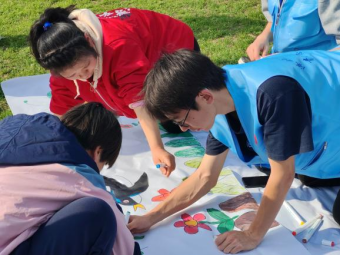 绘画创作是本次活动的核心环节。志愿者们秉持“尊重天性、自由表达”的原则,全程俯身陪伴,引导孩子们以公园花草湖树为蓝本,自由勾勒心中的春天。在集体长卷《我眼中的春天》创作中,孩子们稚嫩的笔触交织融合,志愿者协助孩子们共同完成了这幅充满爱意的作品。