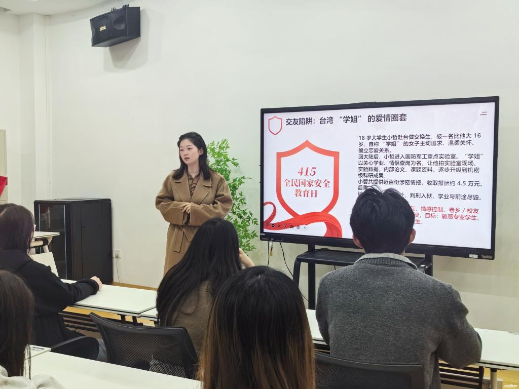 辅导员张雨驰在学生一站式社区开展国家安全主题班会,学院30余名学生代表参加,此次班会结合设计专业学生常见问题重点列举学生随手发布课程设计中的涉密作品、涉密方案被违规盗用以及未经许可拍摄校园设计实验室涉密设备、上传涉密素材至网络被非法转载的案例,引导学生树立“保密无小事”的责任意识,提醒学生在日常生活中易被忽视的国家安全隐患——如陌生人员索要专业设计原稿、网络上诱导转发未经证实的敏感设计相关言论等,要求学生时刻保持警惕,自觉规避安全风险。