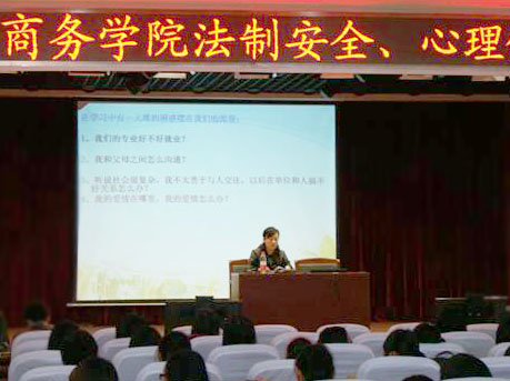 (大学生记者 许凤珊 张朋 摄影 方晓东)4月7日,旅游与商务学院在南苑多功能报告厅举办了以“法制安全及心理健康教育”为主题的讲座。旅商学院党总支书记石建华、团总支书记肖路、辅导员潘炎松、王珊珊以及全院在校学生出席了此次讲座。
