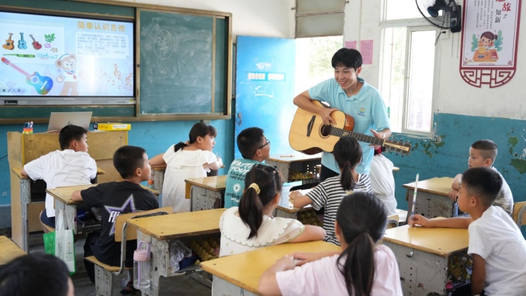 “小手摇出星星模样,遨游太空是我们梦想。”“老师的目光软得就像棉花糖,明天的作业先丢给月亮。”7月13日,钟祥市张集小学的校园里,一串串清脆的歌声在校园上空回荡。武汉交通职业学院“慧创”青年志愿服务队的志愿者赵逸鑫正和张集小学的孩子们围坐成圈,弹唱着他们共同创作的歌曲《校园梦想家》。