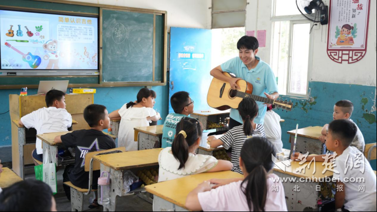 荆楚网(湖北日报网)讯(记者齐一璇 通讯员田松、叶枫)“小手摇出星星模样,遨游太空是我们梦想。”“老师的目光软得就像棉花糖,明天的作业先丢给月亮。”7月13日,钟祥市张集小学的校园里,一串串清脆的歌声在校园上空回荡。武汉交通职业学院“慧创”青年志愿服务队的志愿者赵逸鑫正和孩子们围坐成圈,弹唱着他们共同创作的歌曲《校园梦想家》。