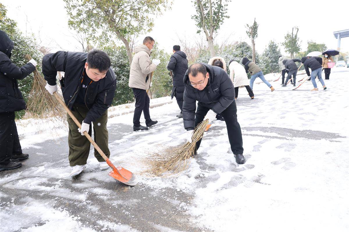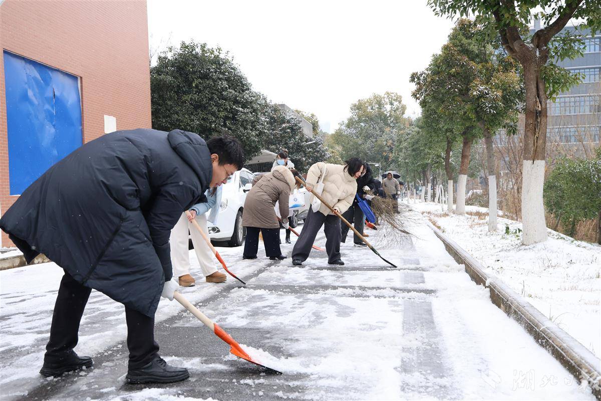 1月20日,武汉交通职业学院年轻干部培训班学员自发前往学校公租房区域开展铲雪除冰志愿服务。