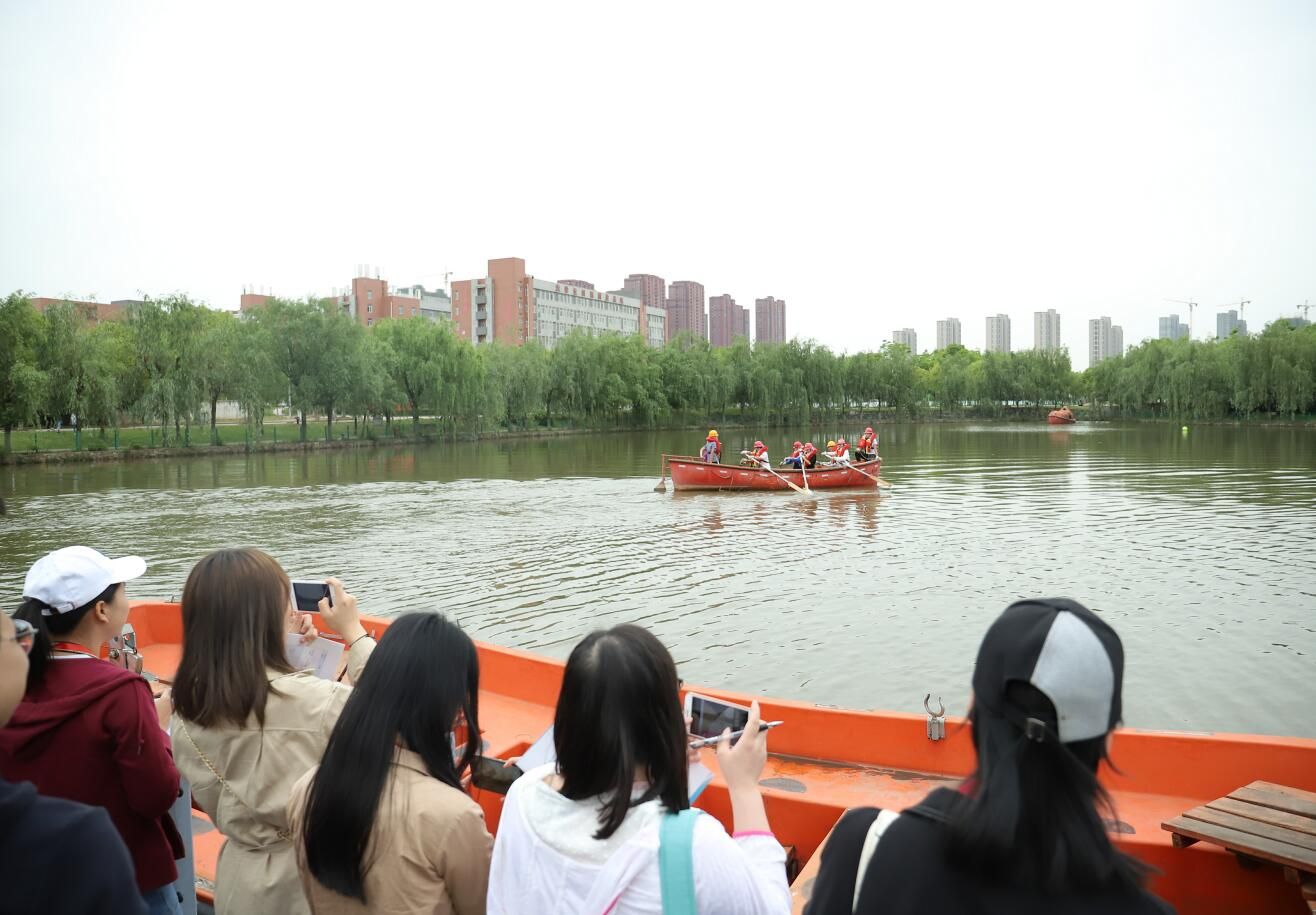 全国融媒采访团走进武汉交通职业学院非机动救生艇操纵竞赛现场。